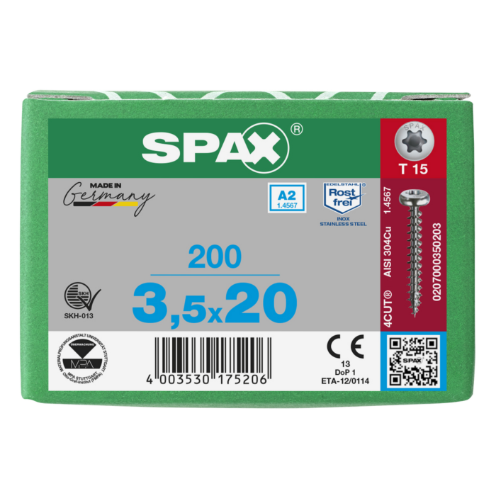 Spax spaanplaatschroeven T15 cilinderkop RVS A2 3.5 x 20 mm voldraad 200 stuks